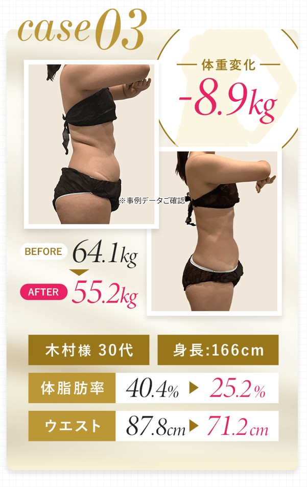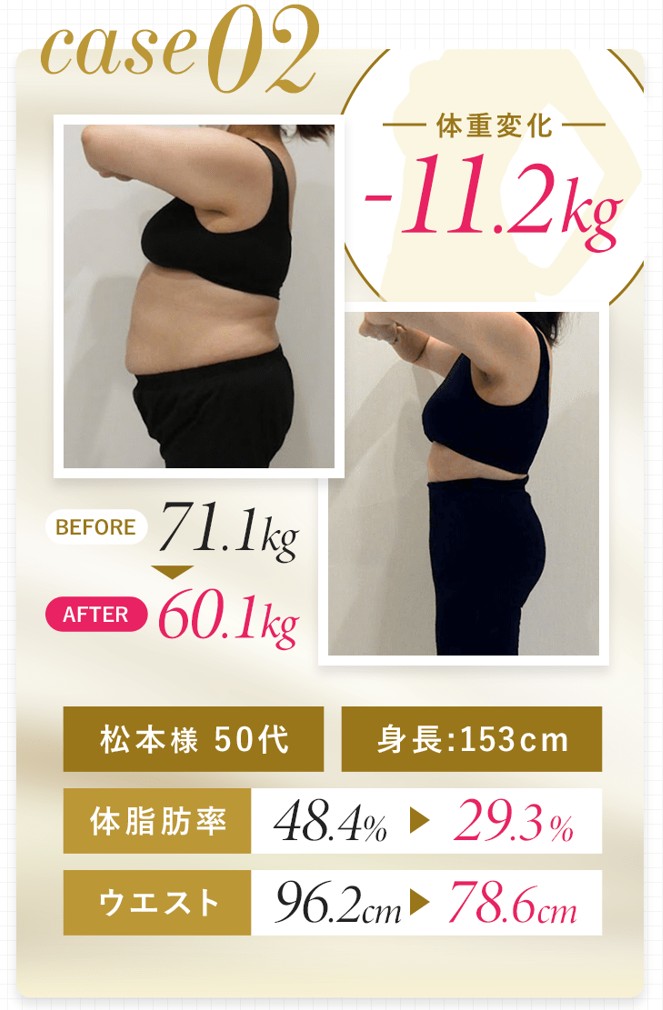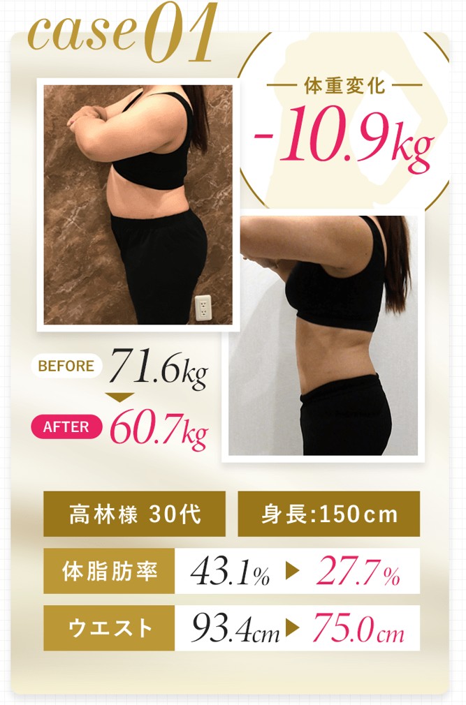 今まであらゆるダイエットをしてきて高級な外車を買えるほど費やしリバウンドしてきてここが最後の砦と思いチャレンジしました。栄養指導やリバウンドしにくい脂肪冷却お薬食欲を抑える注射などにて筋肉代謝を落とさないよう脂肪と体重減少ができ、半年で14キロ希望以上の減少に繋がり大変嬉しく思っております!栄養指導して頂いた事を意識しながらいつまでも若々しく保っていけますよう人生エンジョイしていきます!ありがとうございました!