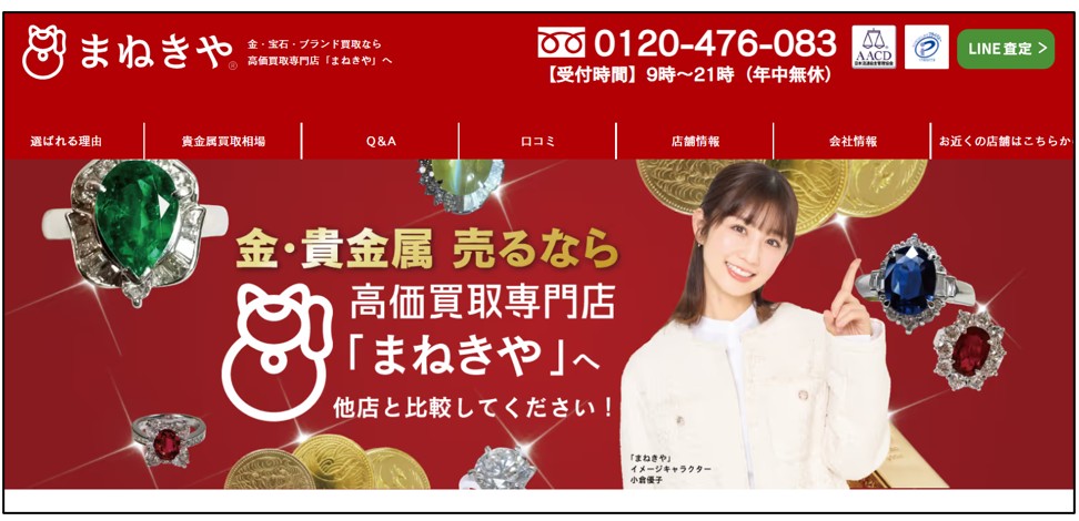 「まねきや」は、金・宝石に強く、独自の販売ルートと経験豊富な査定士による高価買取で、圧倒的支持されている優良買取店